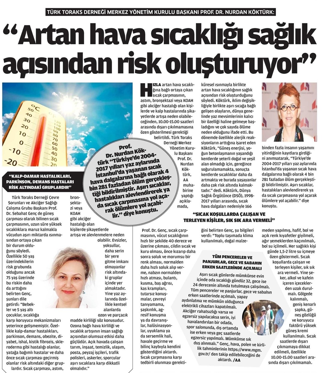 Basında Türk Toraks Derneği Çevre Sorunları ve Akciğer Sağlığı Çalışma Grubu "TÜRK TORAKS DERNEĞİ UYARIYOR! Aşırı sıcaklar geliyor. Sağlık risklerine dikkat!" ile İlgili Açıklaması
