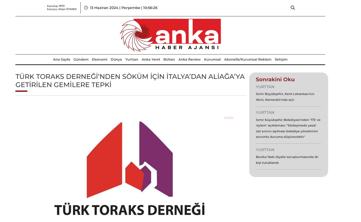 Basında Türk Toraks Derneği Çevre Sorunları ve Akciğer Sağlığı Çalışma Grubu "Aliağa Gemi Söküm Tesisine Demir Atan İtalyan ÖLÜM GEMİLERİ: Asbest Ekolojik Ortama ve İnsan Sağlığına Zararlıdır" Bilgilendirme Yazısı