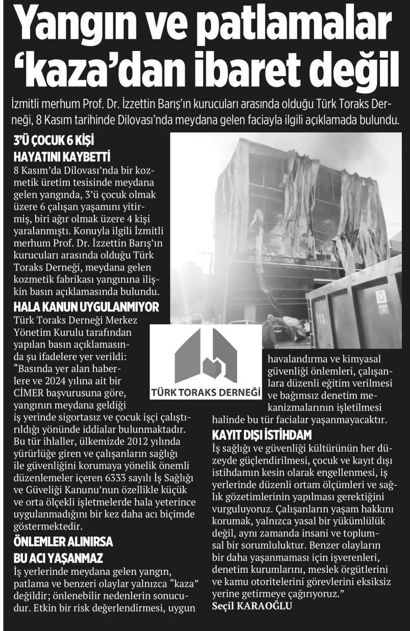 Basında Türk Toraks Derneği Mesleksel Akciğer Hastalıkları Çalışma Grubu "Kocaeli-Dilovası’nda Meydana Gelen Kozmetik Fabrikası Yangınına İlişkin" Basın Bildirisi 29.12.2025
