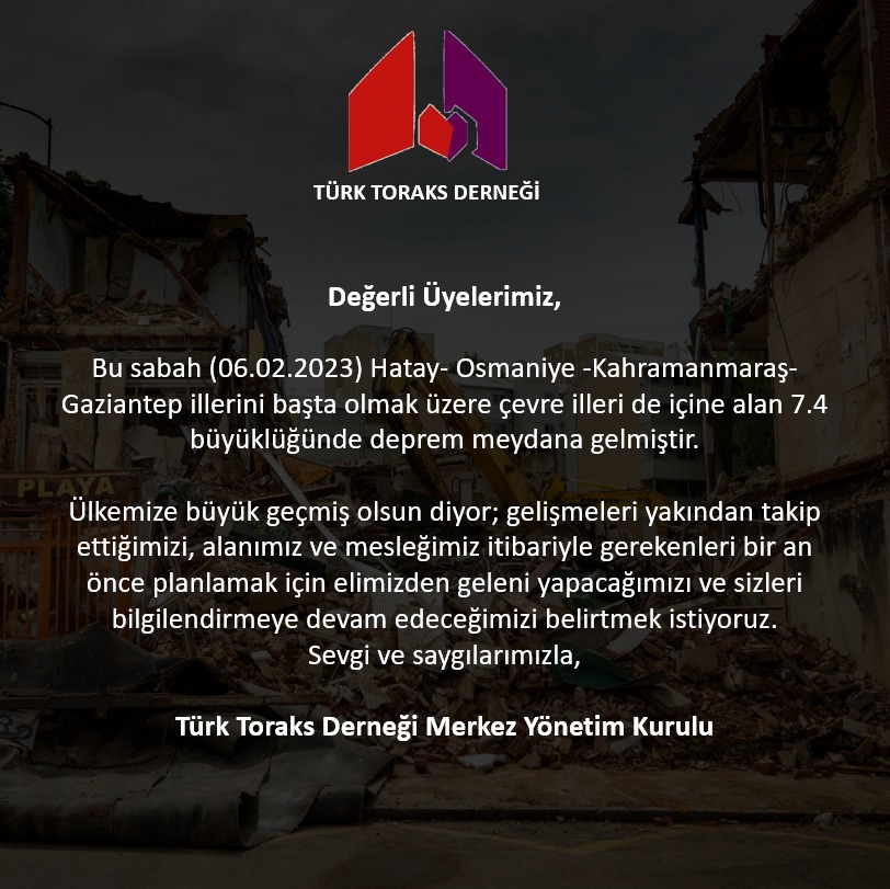 Ülkemize büyük geçmiş olsun diyor; gelişmeleri yakından takip ettiğimizi, alanımız ve mesleğimiz itibariyle gerekenleri bir an önce planlamak için elimizden geleni yapacağımızı ve sizleri bilgilendirmeye devam edeceğimizi belirtmek istiyoruz.