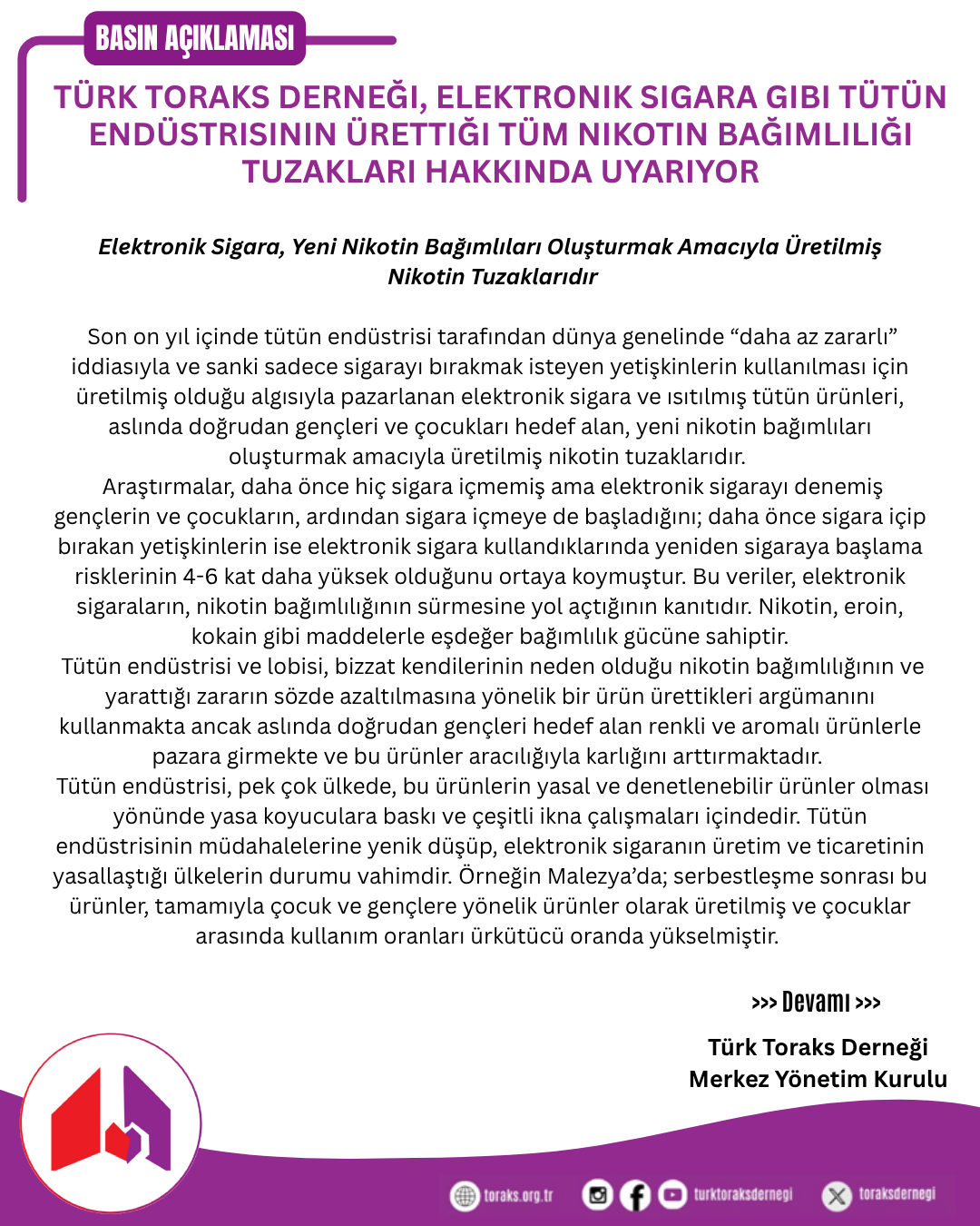 Türk Toraks Derneği' nin "Türk Toraks Derneği, Elektronik Sigara Gibi Tütün Endüstrisinin Ürettiği Tüm Nikotin Bağımlılığı Tuzakları Hakkında Uyarıyor" başlıklı basın bildirisine aşağıdaki linkten ulaşabilirsiniz.