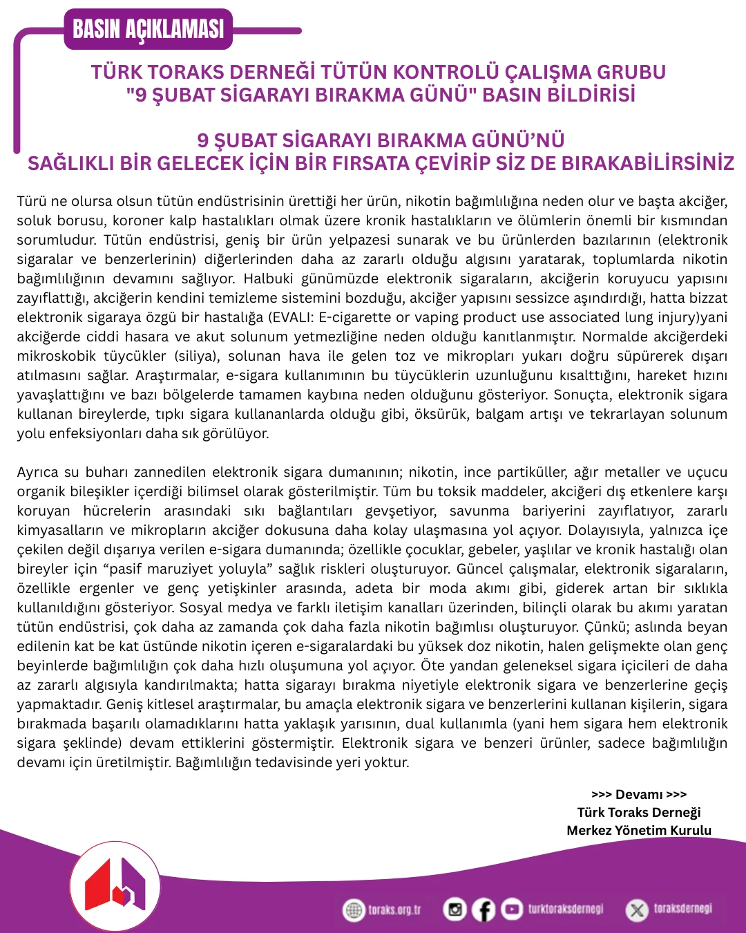 Türk Toraks Derneği' nin "9 Şubat Sigarayı Bırakma Günü" ile ilgili basın bildirisine aşağıdaki linkten ulaşabilirsiniz.