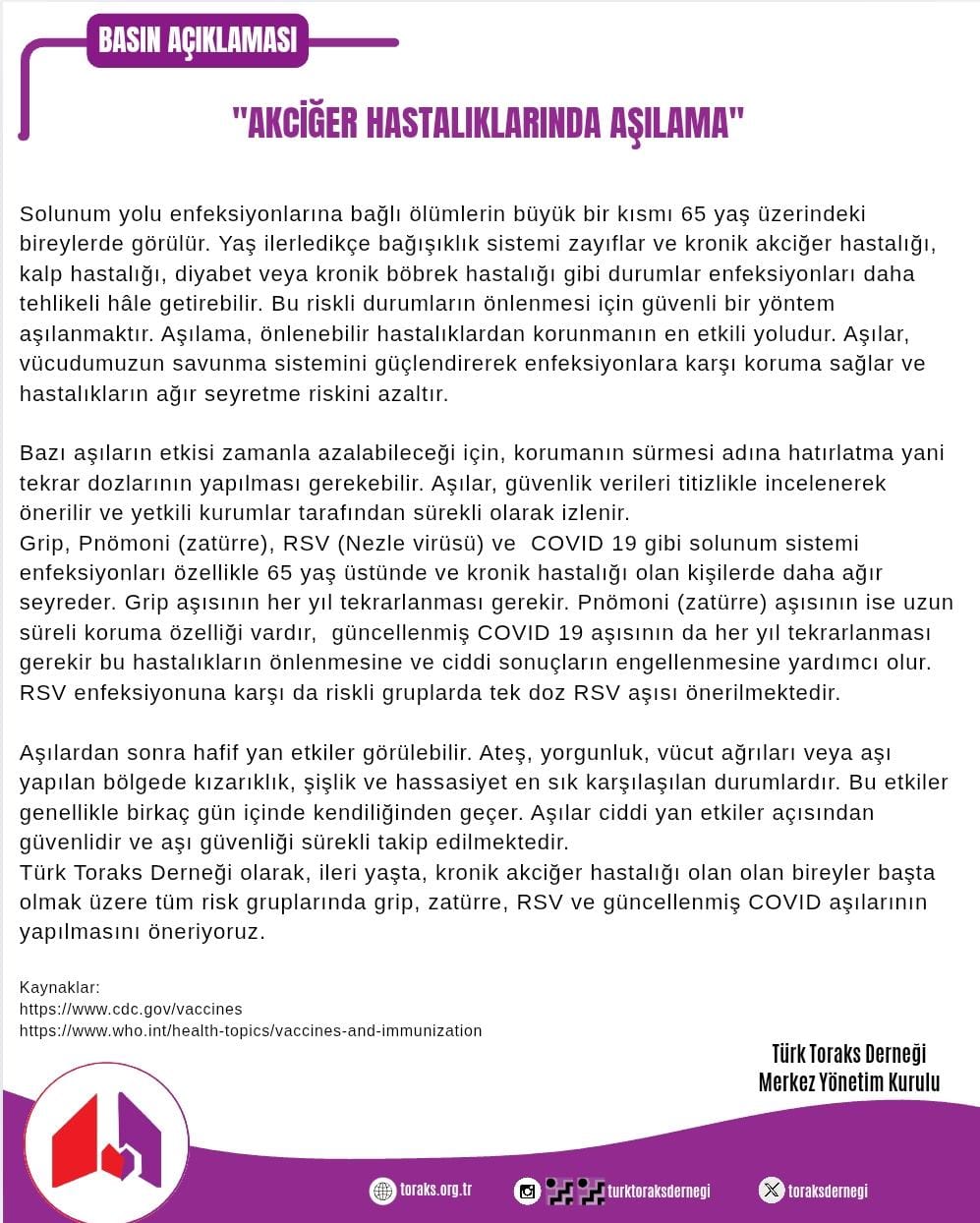 Türk Toraks Derneği' nin "Akciğer Hastalıklarında Aşılama" ile ilgili basın bildirisine aşağıdaki linkten ulaşabilirsiniz.