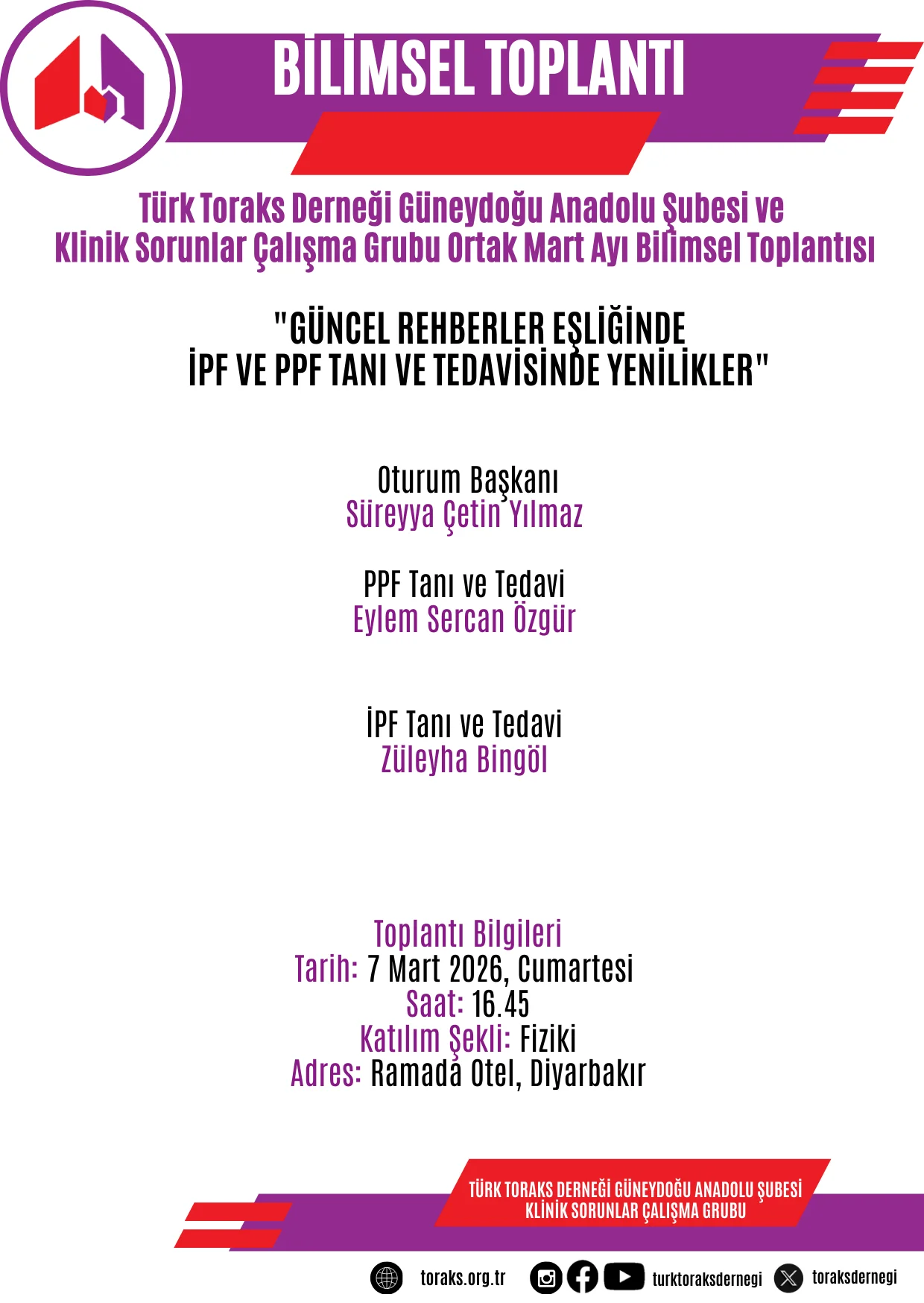 Türk Toraks Derneği Güneydoğu Anadolu Şubesi ve Klinik Sorunlar Çalışma Grubu Ortak Mart Ayı Bilimsel Toplantı Duyurumuz: "Güncel Rehberler Eşliğinde İPF ve PPF Tanı ve Tedavisinde Yenilikler"