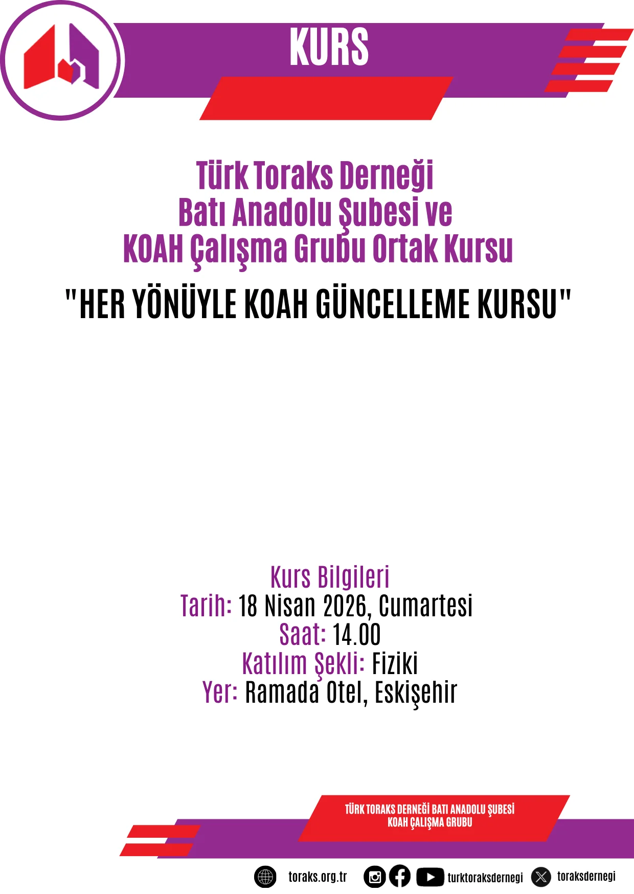 Türk Toraks Derneği Batı Anadolu Şubesi'nin, KOAH Çalışma Grubu ile ortak düzenlediği "Her Yönüyle KOAH Güncelleme Kursu" 18 Nisan 2026 Cumartesi günü, saat 14.00'te Eskişehir'de gerçekleşecektir.