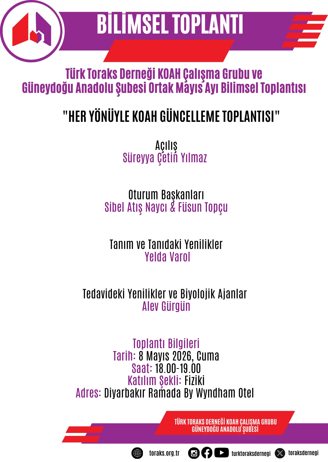 Türk Toraks Derneği KOAH Çalışma Grubu'nun Güneydoğu Anadolu Şubesi ile ortak düzenlediği Mayıs ayı bilimsel toplantısı "Her Yönüyle KOAH Güncelleme Toplantısı" başlığı ile 8 Mayıs 2026 Cuma günü, 18.00-19.00 saatleri arasında Diyarbakır' da gerçekleştirilecektir.
