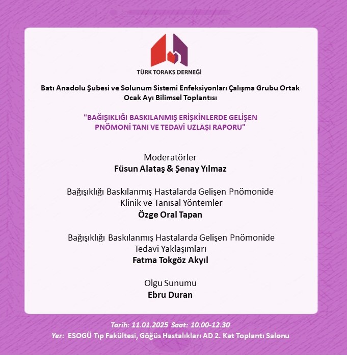 Türk Toraks Derneği Batı Anadolu Şubesi ve Solunum Sistemi Enfeksiyonları Çalışma Grubu Ortak Ocak Ayı Bilimsel Toplantı Duyurumuz: "Bağışıklığı Baskılanmış Erişkinlerde Gelişen Pnömoni Tanı ve Tedavi Uzlaşı Raporu"