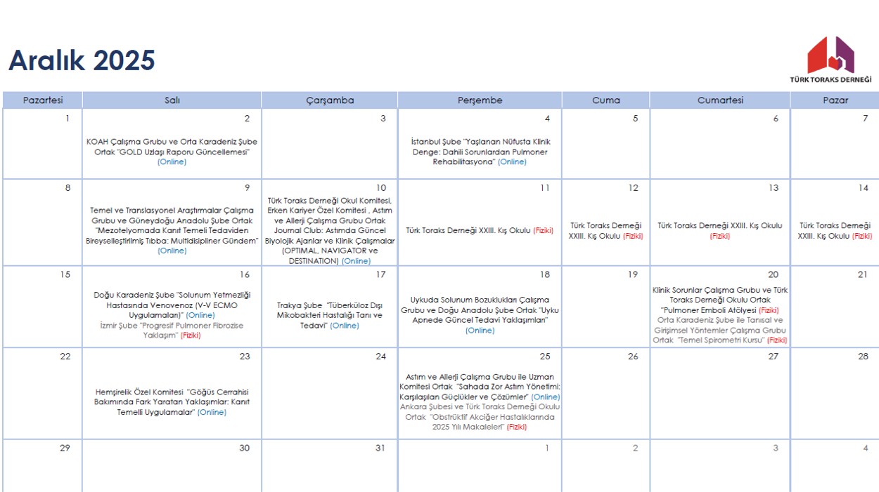 Türk Toraks Derneği Aralık 2025 Etkinlik Takvimi