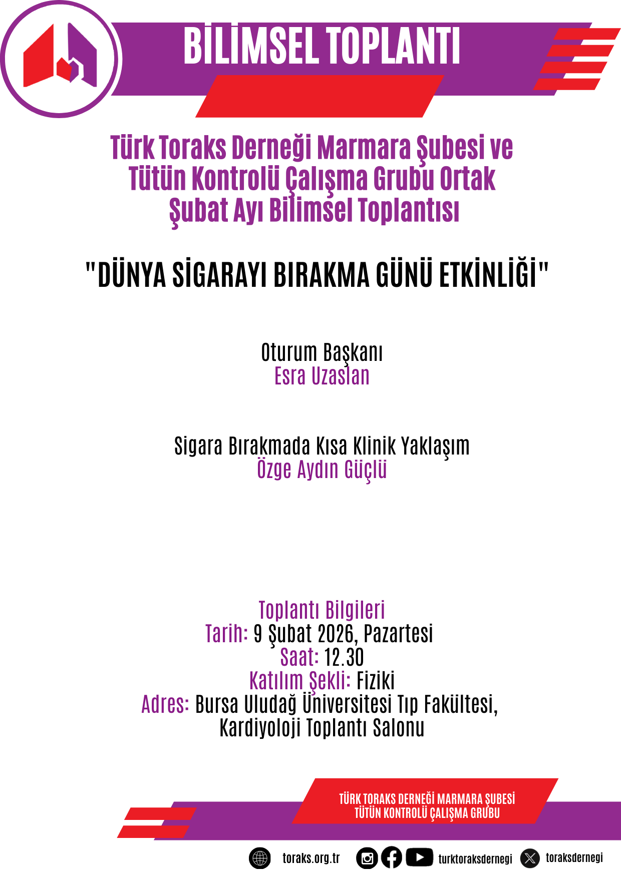 Türk Toraks Derneği Marmara Şubesi'nin Tütün Kontrolü Çalışma Grubu ile ortak düzenlediği Şubat ayı bilimsel toplantısı "Dünya Sigarayı Bırakma Günü Etkinliği" başlığı ile 9 Şubat 2026 Pazartesi günü, saat 12.30 da Bursa' da gerçekleştirilecektir.