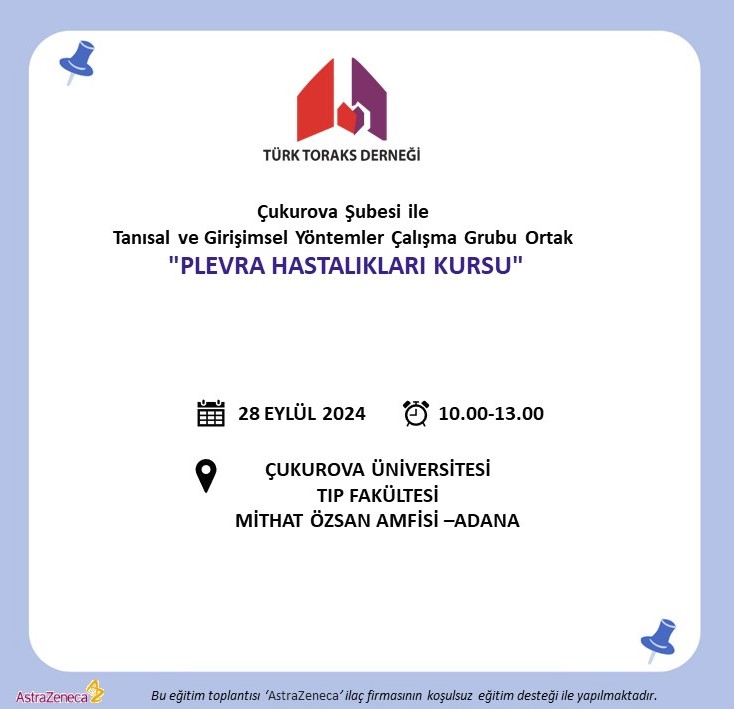 Türk Toraks Derneği Çukurova Şubesi ile Tanısal ve Girişimsel Yöntemler Çalışma Grubu Ortak Kurs Duyurumuz: "Plevra Hastalıkları Kursu"