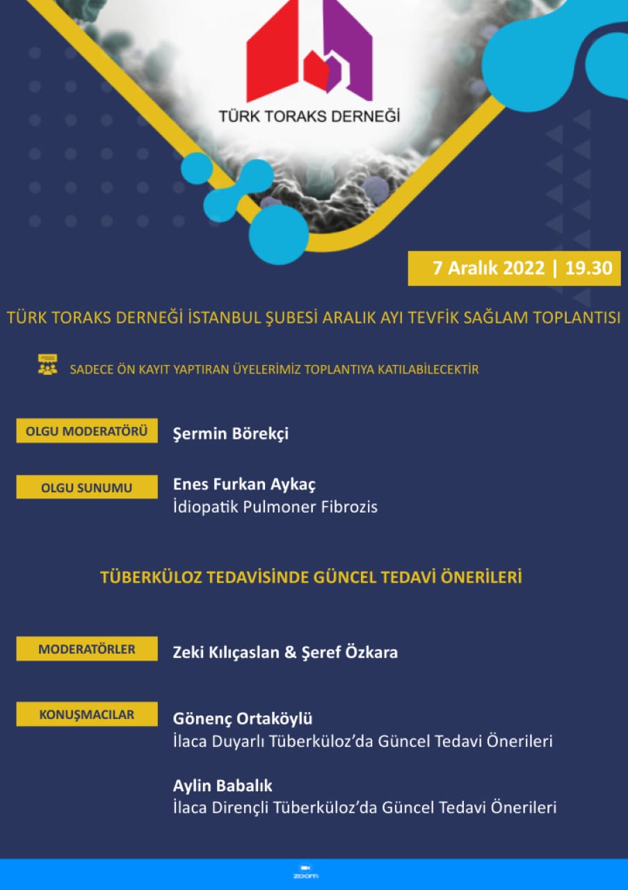 Türk Toraks Derneği İstanbul Şubesi Aralık ayı webinarı 7 Aralık 2022 Çarşamba günü, saat 19.30' da gerçekleşecektir.