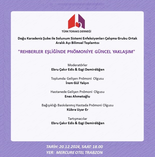 Türk Toraks Derneği Doğu Karadeniz Şubesi ve Solunum Sistemi Enfeksiyonları Çalışma Grubu Ortak Aralık Ayı Bilimsel Toplantı Duyurumuz: "Rehberler Eşliğinde Pnömoniye Güncel Yaklaşım"