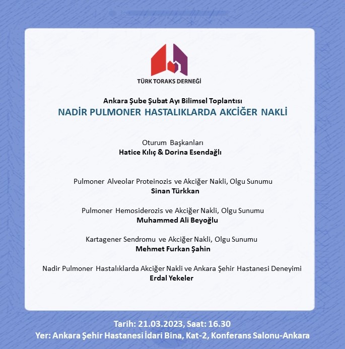 Türk Toraks Derneği Ankara Şubesi Mart Ayı Bilimsel Toplantı Duyurumuz: "Nadir Pulmoner Hastalıklarda Akciğer Nakli"