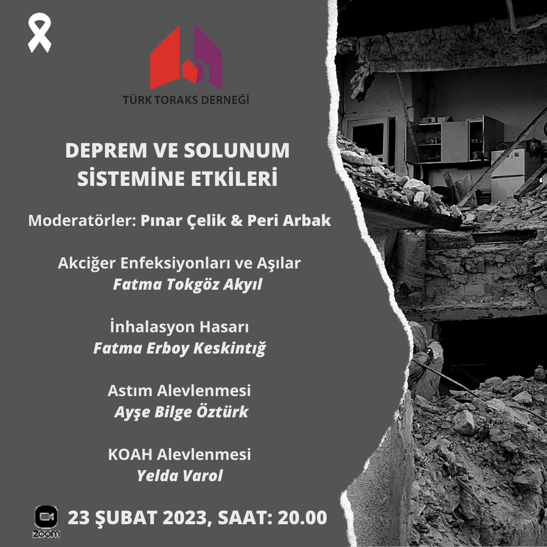 Ülkemizde 06.02.2023 tarihinde yaşanan ve genel hayatı etkileyen depremler nedeniyle Adana, Adıyaman, Kahramanmaraş, Hatay, Diyarbakır, Gaziantep, Kilis, Malatya, Osmaniye, Şanlıurfa illeri ve ilçelerinde yaşayan meslektaşlarımıza destek olmak amacıyla 23 Şubat 2023 Perşembe günü, saat 20.00 da yapacağımız “Deprem ve Solunum Sistemine Etkileri” webinarımıza katılımlarınızı bekliyoruz.