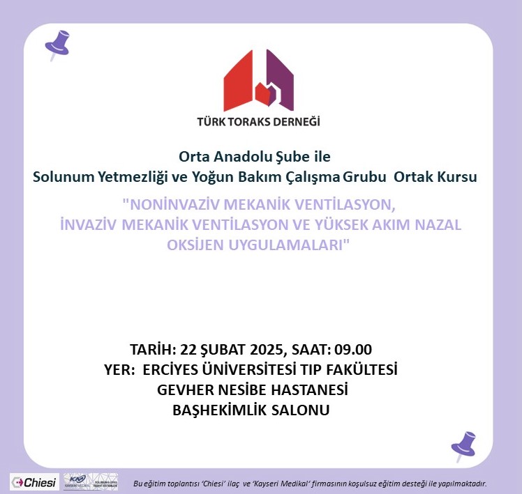 Türk Toraks Derneği Orta Anadolu Şubesi ile Solunum Yetmezliği ve Yoğun Bakım Çalışma Grubu Ortak Kurs Duyurumuz: "Noninvaziv Mekanik Ventilasyon, İnvaziv Mekanik Ventilasyon ve Yüksek Akım Nazal Oksijen Uygulamaları"