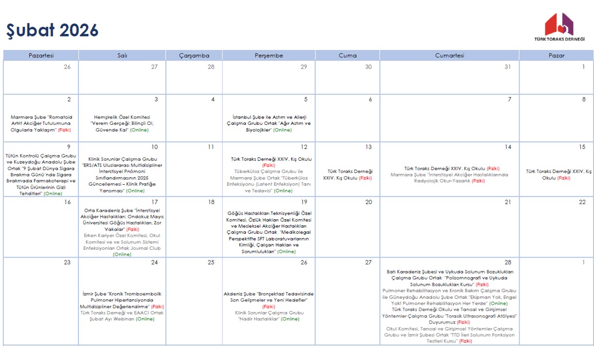 Türk Toraks Derneği Şubat 2026 Etkinlik Takvimi