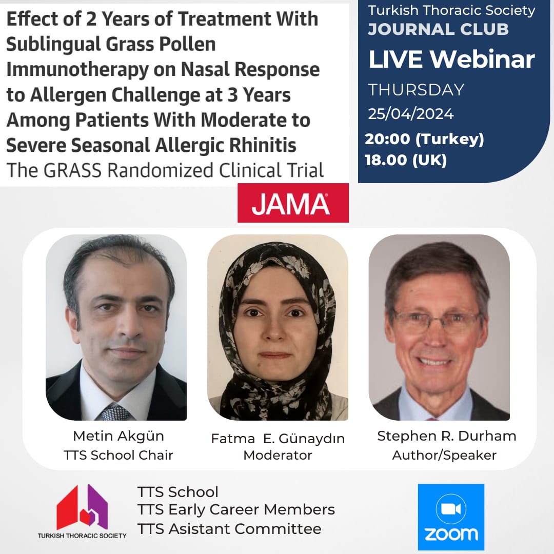 Bu bağlamda seçtiğimiz ilk makale, JAMA dergisinde yayımlanan "Effect of 2 Years of Treatment With Sublingual Grass Pollen Immunotherapy on Nasal Response to Allergen Challenge at 3 Years Among Patients With Moderate to Severe Seasonal Allergic Rhinitis: The GRASS Randomized Clinical Trial" başlıklı çalışmadır. Makalenin sunumu, Stephen R. Durham, MD tarafından (Imperial College London, Allergy and Clinical Immunology, Inflammation, Repair and Development Section) yapılacaktır. Programın Moderatörlüğünü TTD Okul Başkanı Metin Akgün ve TTD Erken Kariyer Özel Komitesi Üyesi Fatma Esra Günaydın yapacaktır.