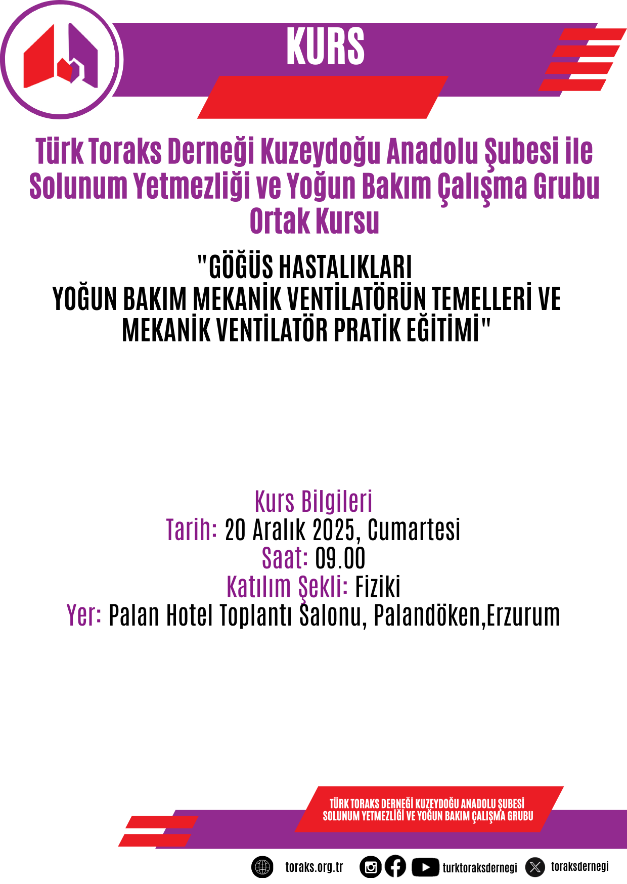 20 Aralık 2025 Cumartesi günü Erzurum' da gerçekleştirilecek olan "Göğüs Hastalıkları Yoğun Bakım Mekanik Ventilatörün Temelleri ve Mekanik Ventilatör Pratik Eğitimi" katılımcı listesi ekte bilgilerinize sunulmuştur.