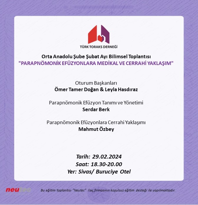 Türk Toraks Derneği Orta Anadolu Şube Şubat Ayı Bilimsel Toplantı Duyurumuz: "Parapnömonik Efüzyonlara Medikal ve Cerrahi Yaklaşım"