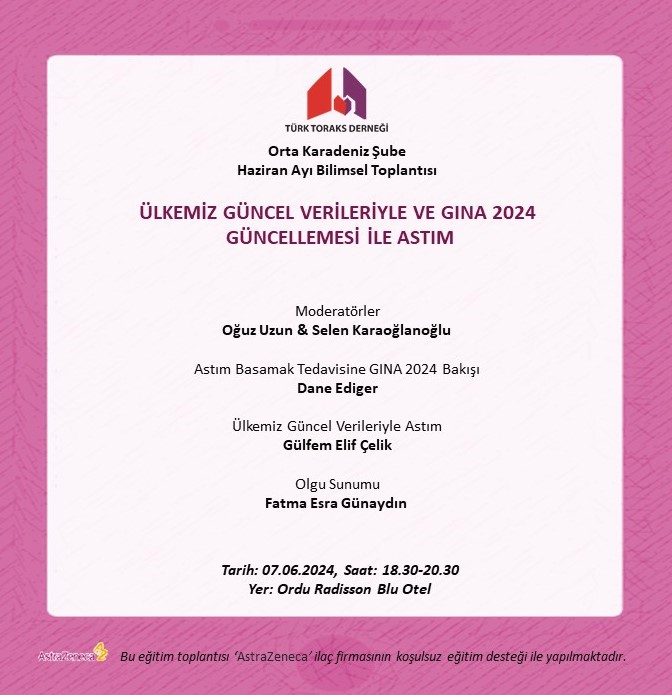 Türk Toraks Derneği Orta Karadeniz Şubesi Haziran Ayı Bilimsel Toplantısı Duyurumuz: "Ülkemiz Güncel Verileriyle ve GINA 2024 Güncellemesi ile Astım "