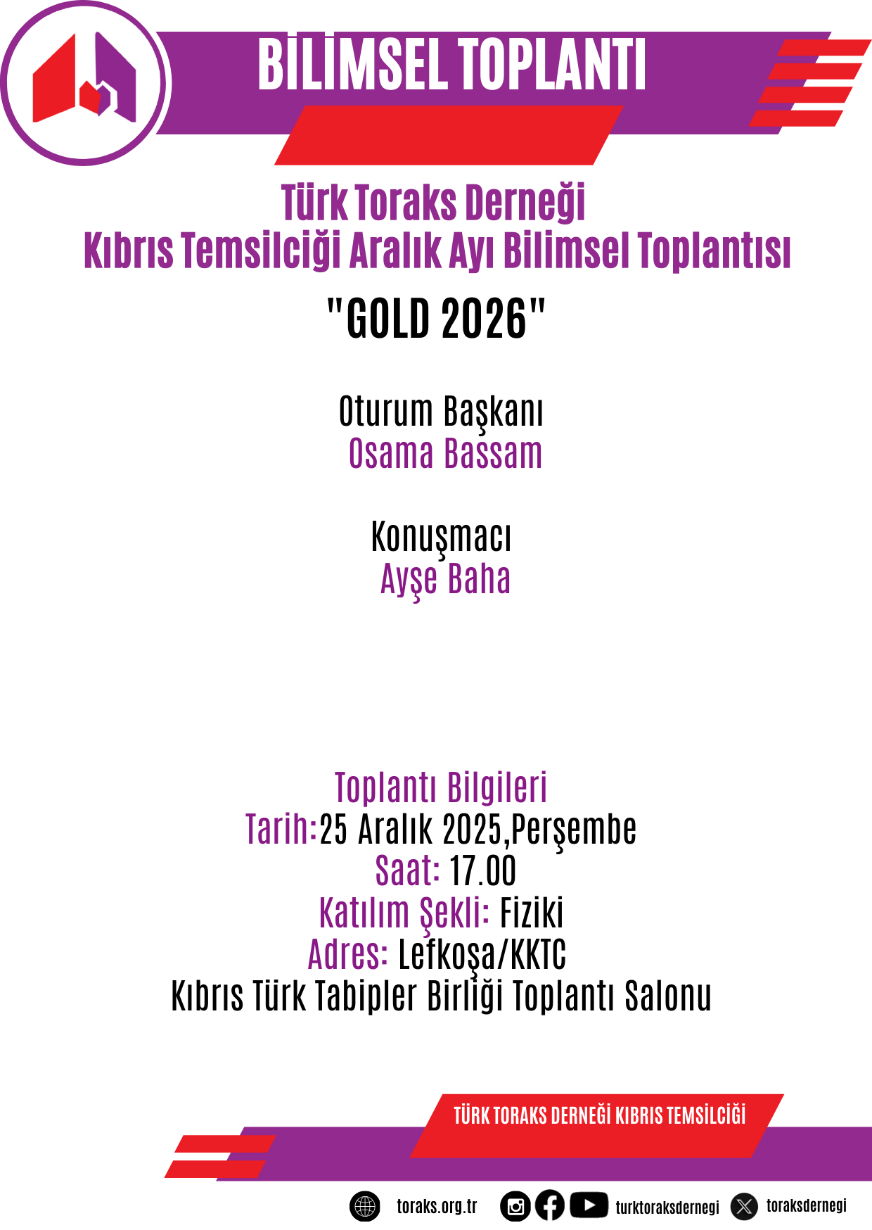 Türk Toraks Derneği Kıbrıs Temsilciği Aralık ayı bilimsel toplantısı "GOLD 2026" başlığı ile 25 Aralık 2025 Perşembe günü, saat 17.00' da Kıbrıs' da gerçekleştirilecektir.
