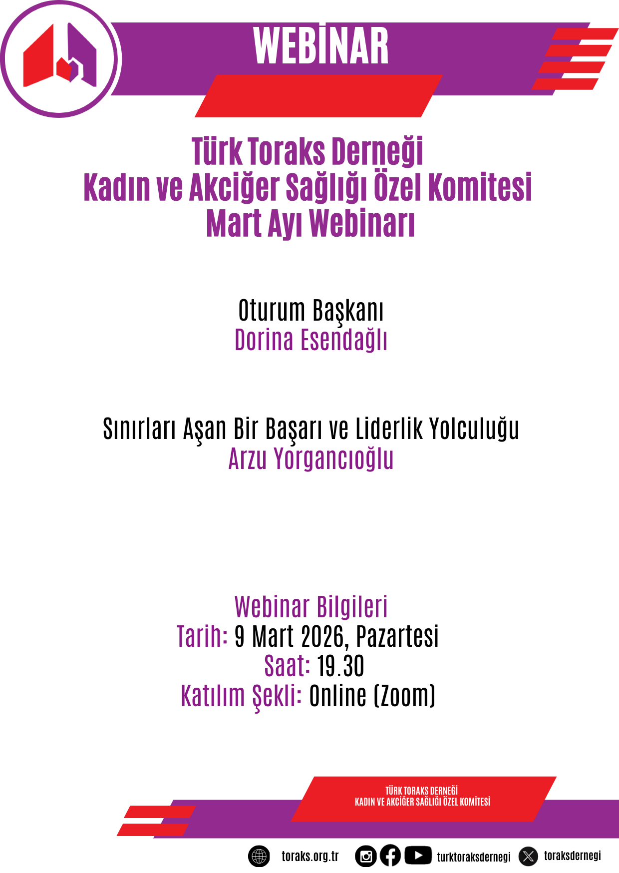 8 Mart Dünya Kadınlar Günü nedeni ile Türk Toraks Derneği Kadın ve Akciğer Sağlığı Özel Komitesi Mart ayı webinarı 9 Mart 2026 Pazartesi günü, saat 19.30' da online olarak gerçekleşecektir.