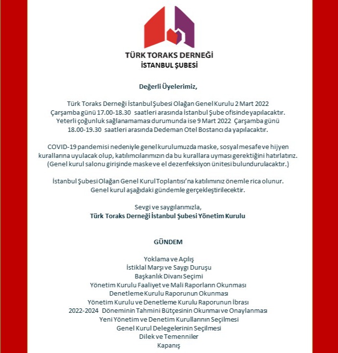 Türk Toraks Derneği İstanbul Şubesi Olağan Genel Kurulu 2 Mart 2022 Çarşamba günü 17.00-18.30 saatleri arasında İstanbul Şube ofisinde yapılacaktır. Yeterli çoğunluk sağlanamaması durumunda ise 9 Mart 2022 Çarşamba günü 18.00-19.30 saatleri arasında Dedeman Otel Bostancı da yapılacaktır.