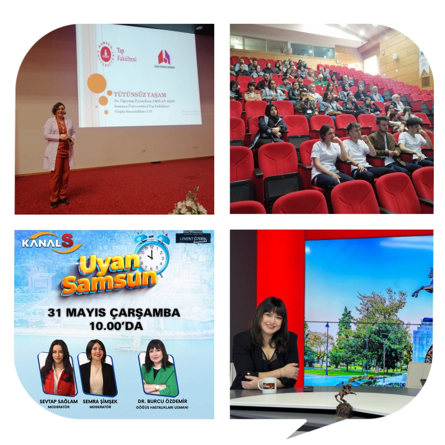 Türk Toraks Derneği Orta Karadeniz Şubesi "31 Mayıs Dünya Tütünsüz Günü" etkinlikleri kapsamında; Dr. Esra Arslan Aksu tarafından Samsun Eğitim ve Araştırma Hastanesi çalışanları ile stajyer hemşirelere sunum yapılmış olup; Dr. Burcu Özdemir yerel televizyon programına katılım sağlanmıştır.