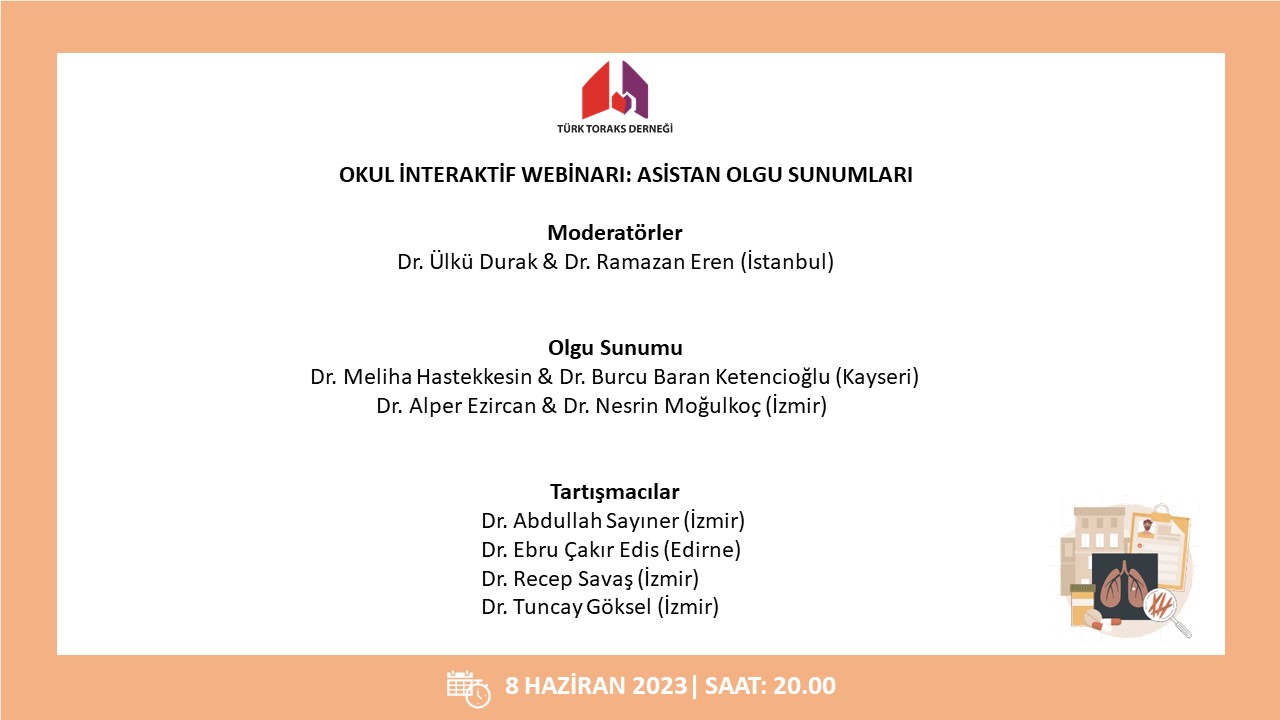 Türk Toraks Derneği okulu interaktif webinarının on ikincisi 8 Haziran 2023 Perşembe günü, saat 20.00 da “Asistan Olgu Sunumları” başlığı ile gerçekleştirilecek olup; katılımlarınız onur verecektir.