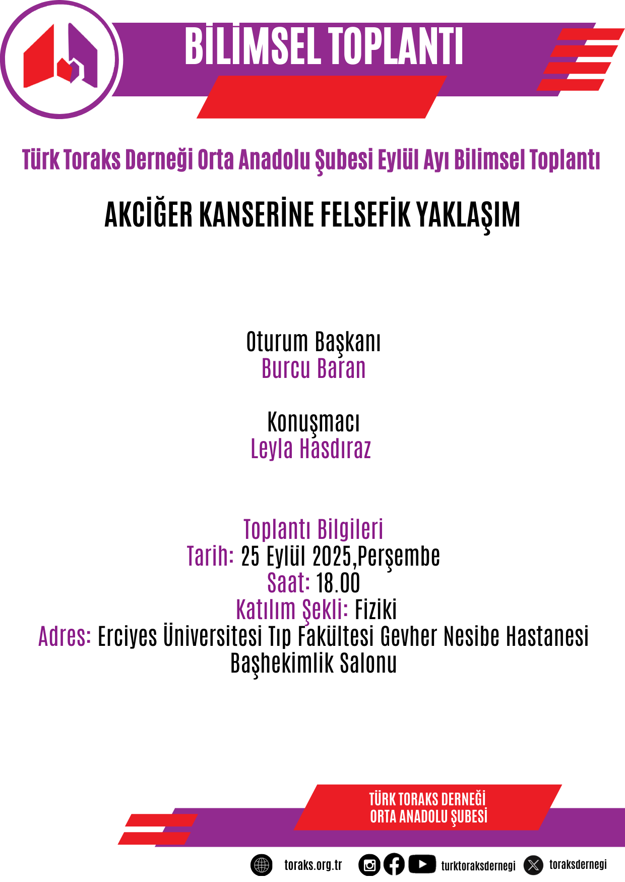 Türk Toraks Derneği Orta Anadolu Şube Eylül Ayı Bilimsel Toplantı Duyurumuz: "Akciğer Kanserine Felsefik Yaklaşım"