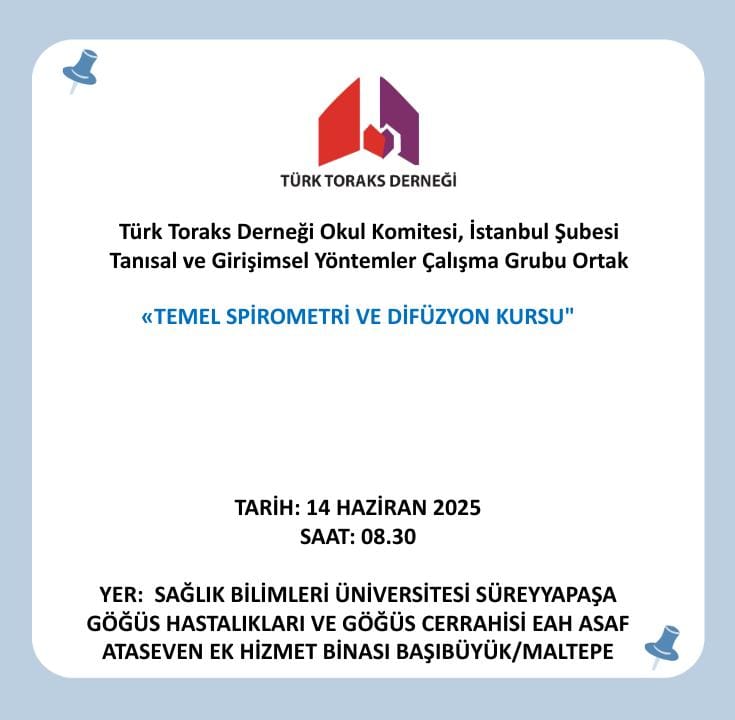Türk Toraks Derneği Okul Komitesi, Tanısal ve Girişimsel Yöntemler Çalışma Grubu ortak "Temel Spirometri ve Difüzyon Kursu" 14 Haziran 2025 Cumartesi günü saat 08.30' da İstanbul' da gerçekleştirilecektir.