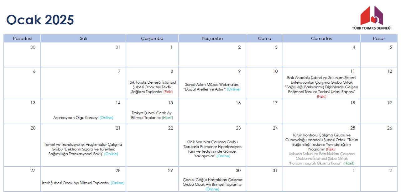 Türk Toraks Derneği Ocak 2025 Etkinlik Takvimi