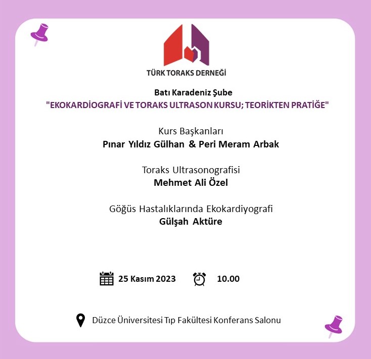 Türk Toraks Derneği Batı Karadeniz Şubesi "Ekokardiografi ve Toraks Ultrason Kursu; Teorikten Pratiğe" kursu 25 Kasım 2023 Cumartesi günü, 10.00-14.00 saatleri arasında Düzce' de gerçekleşecektir.