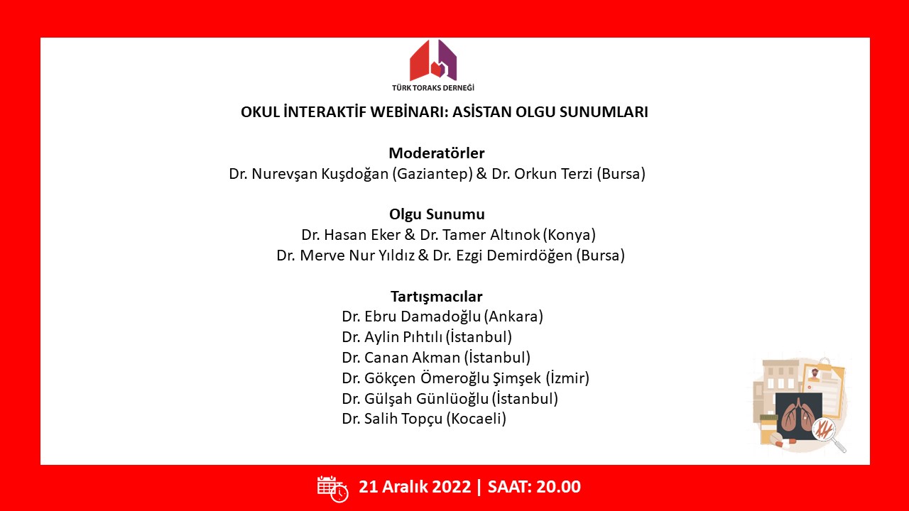 Türk Toraks Derneği okulu interaktif webinarının onuncusu 21 Aralık 2022 Çarşamba günü, saat 20.00 da “Asistan Olgu Sunumları” başlığı ile gerçekleştirilecek olup; katılımlarınız onur verecektir.