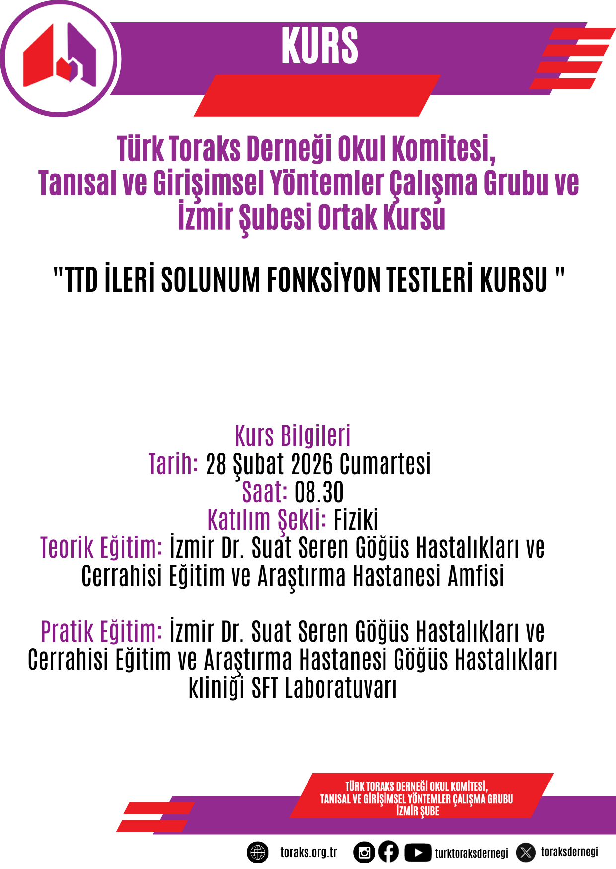 Türk Toraks Derneği Okul Komitesi, Tanısal ve Girişimsel Yöntemler Çalışma Grubu ve İzmir Şubesi ortak "TTD İleri Solunum Fonksiyon Testleri Kursu" 28 Şubat 2026 Cumartesi günü 08.30 da İzmir' de yapılacaktır.