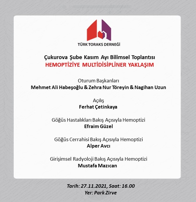 Türk Toraks Derneği Çukurova Şubesi Kasım ayı toplantısı 27.11.2021 Cumartesi günü, 16.00-22.00 saatleri arasında gerçekleşecektir.