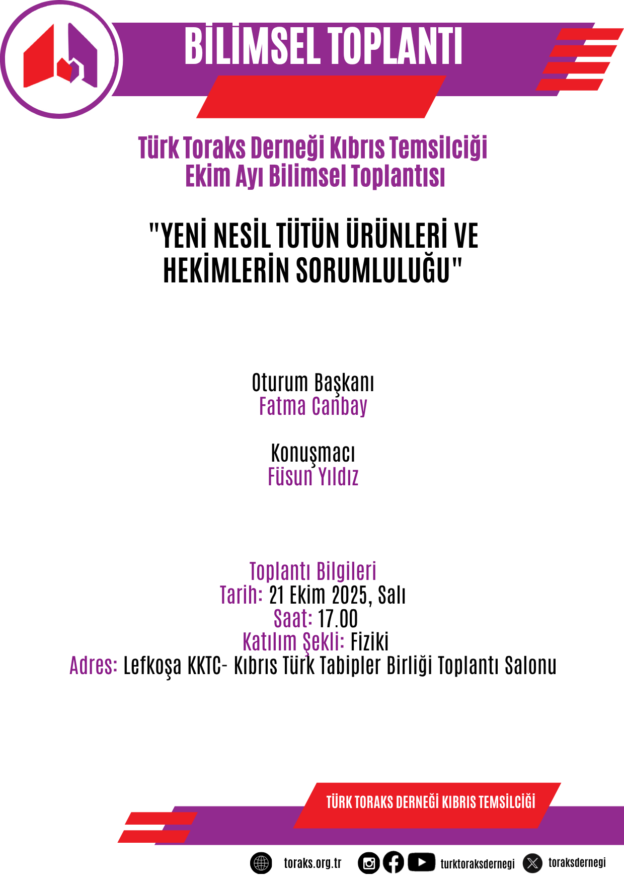 Türk Toraks Derneği Kıbrıs Temsilciği Ekim ayı bilimsel toplantısı "Yeni Nesil Tütün Ürünleri ve Hekimlerin Sorumluluğu" başlığı ile 21 Ekim 2025 Salı günü, saat 17.00' da Kıbrıs' da gerçekleştirilecektir.