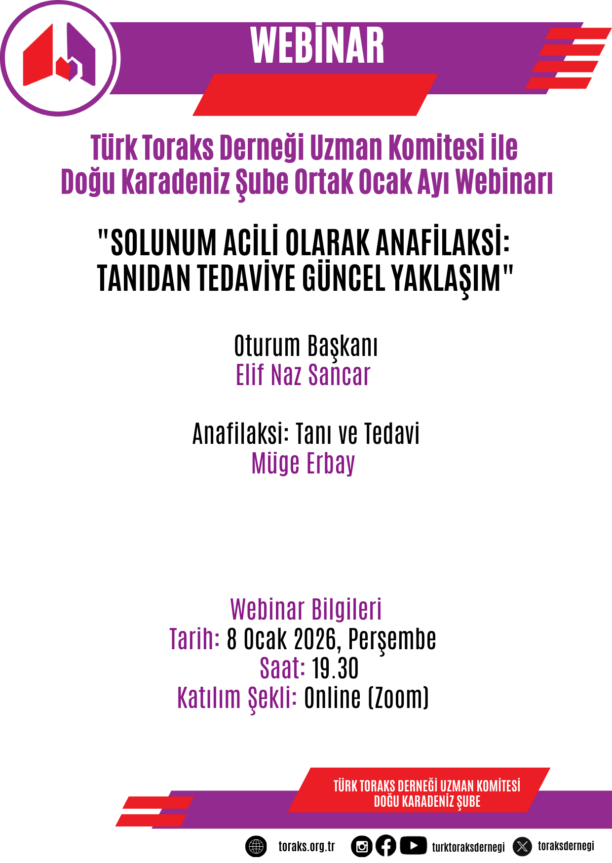 Türk Toraks Derneği Uzman Komitesi'nin Doğu Karadeniz Şube ile ortak düzenlediği Ocak ayı webinarı "Solunum Acili Olarak Anafilaksi: Tanıdan Tedaviye Güncel Yaklaşım" başlığı ile 8 Ocak 2026 Perşembe günü, saat 19.30' da online olarak gerçekleştirilecektir.