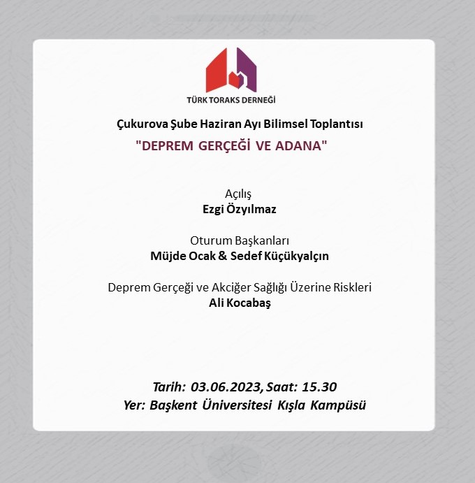 Türk Toraks Derneği Çukurova Şubesi Haziran Ayı Bilimsel Toplantısı Duyurumuz: "Deprem Gerçeği ve Adana"