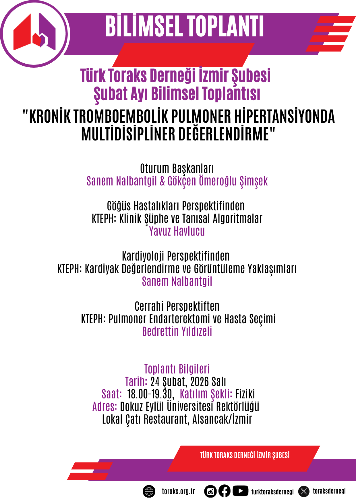 Türk Toraks Derneği İzmir Şubesi Şubat ayı bilimsel toplantısı 24 Şubat 2026 Salı günü, 18.00-19.30 saatleri arasında İzmir'de gerçekleştirilecektir.