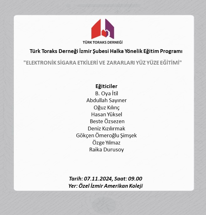 Türk Toraks Derneği İzmir Şubesi İzmir Şubesi Halka Yönelik Eğitim Programı 7 Kasım 2024 Perşembe günü, saat 09.00 da İzmir' de gerçekleştirilecektir.