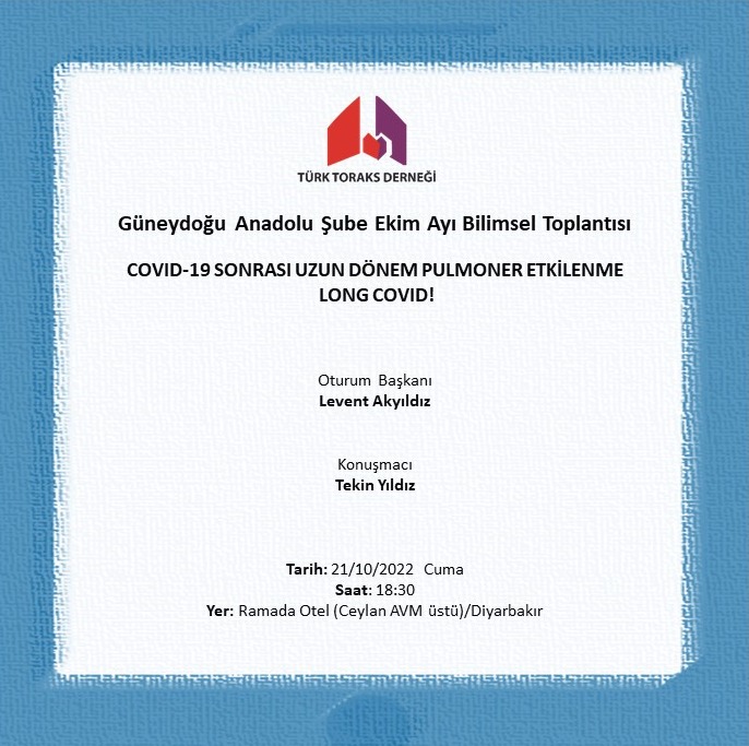 Türk Toraks Derneği Güneydoğu Anadolu Şube Ekim Ayı Bilimsel Toplantısı Duyurumuz: "COVID-19 Sonrası Uzun Dönem Pulmoner Etkilenme. Long COVID!…"