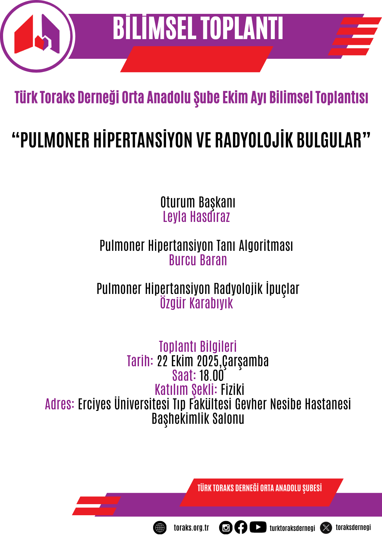 Toplantının başlığı "Pulmoner Hipertansiyon ve Radyolojik Bulgular" olarak belirlenmiş olup; programın ayrıntılarına duyurumuzda yer verilmiştir.