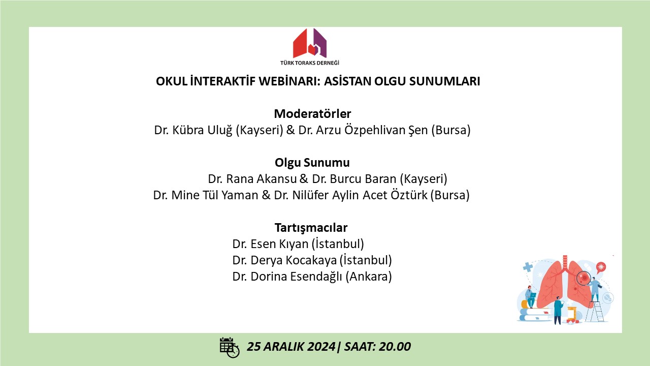 Türk Toraks Derneği okulu interaktif webinarının on sekizincisi 25 Aralık 2024 Çarşamba günü, saat 20.00 da “Asistan Olgu Sunumları” başlığı ile gerçekleştirilecek olup; katılımlarınız onur verecektir.
