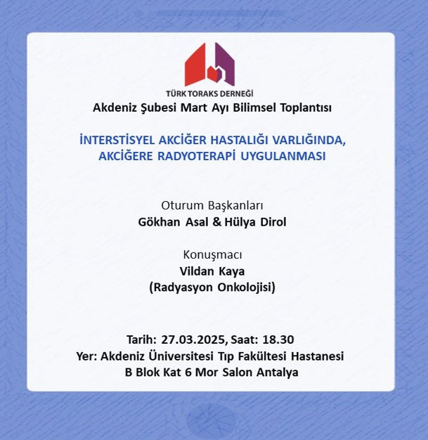 Türk Toraks Derneği Akdeniz Şube Mart Ayı Bilimsel Toplantı Duyurumuz: "İnterstisyel Akciğer Hastalığı Varlığında, Akciğere Radyoterapi Uygulanması"