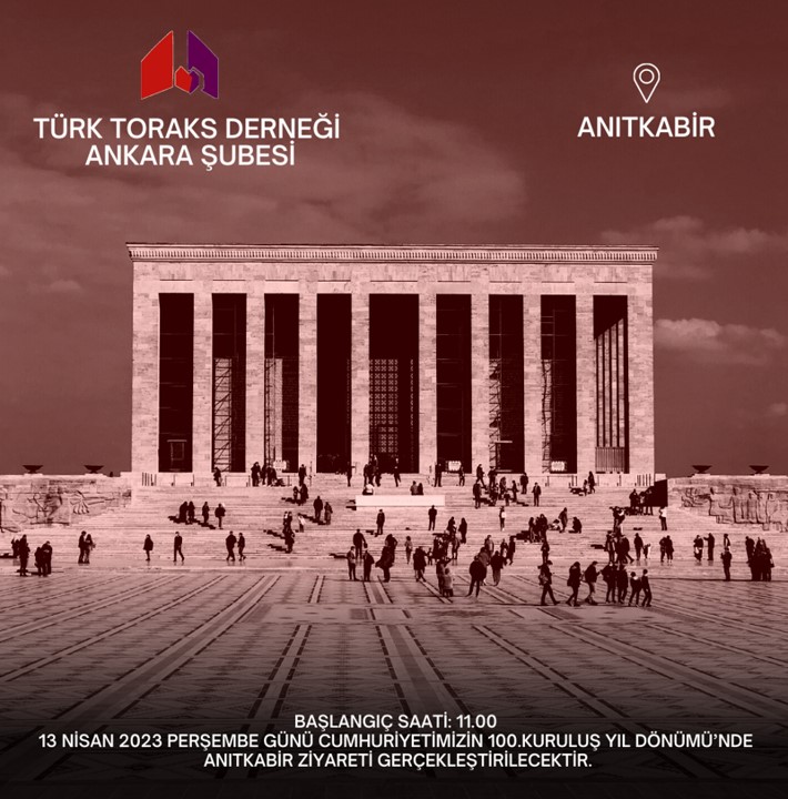 Türk Toraks Derneği Ankara Şubesi Yönetim Kurulu olarak “CUMHURİYETİMİZİN 100.KURULUŞ YIL DÖNÜMÜ’NDE” Cumhuriyet'in kurucusu Ulu Önder Mustafa Kemal Atatürk'ün ebedi istirahatgahı olan Anıtkabir’i 13 Nisan saat 11:00’da askeri tören ve çelenk koyma merasimiyle ziyaret etmeyi planladık.
