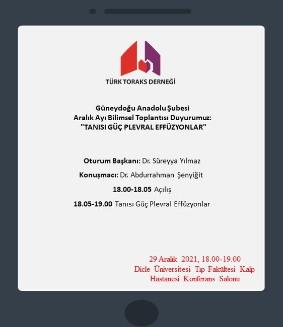 Türk Toraks Derneği Güneydoğu Anadolu Şubesi Aralık ayı toplantısı 29.12.2021 Çarşamba günü, 18.00-19.00 saatleri arasında gerçekleşecektir.