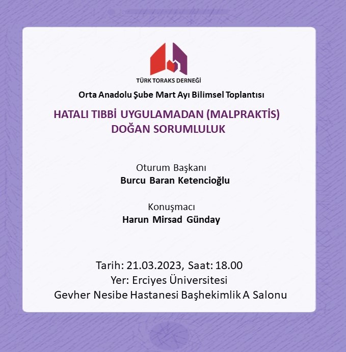 Türk Toraks Derneği Orta Anadolu Şube Mart Ayı Bilimsel Toplantı Duyurumuz: "Hatalı Tıbbi Uygulamadan (Malpraktis) Doğan Sorumluluk"