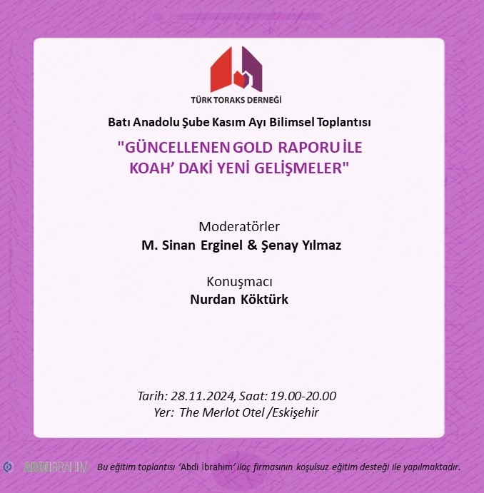 Türk Toraks Derneği Batı Anadolu Şubesi Kasım Ayı Bilimsel Toplantı Duyurumuz: "Güncellenen GOLD Raporu ile KOAH’ daki Yeni Gelişmeler"
