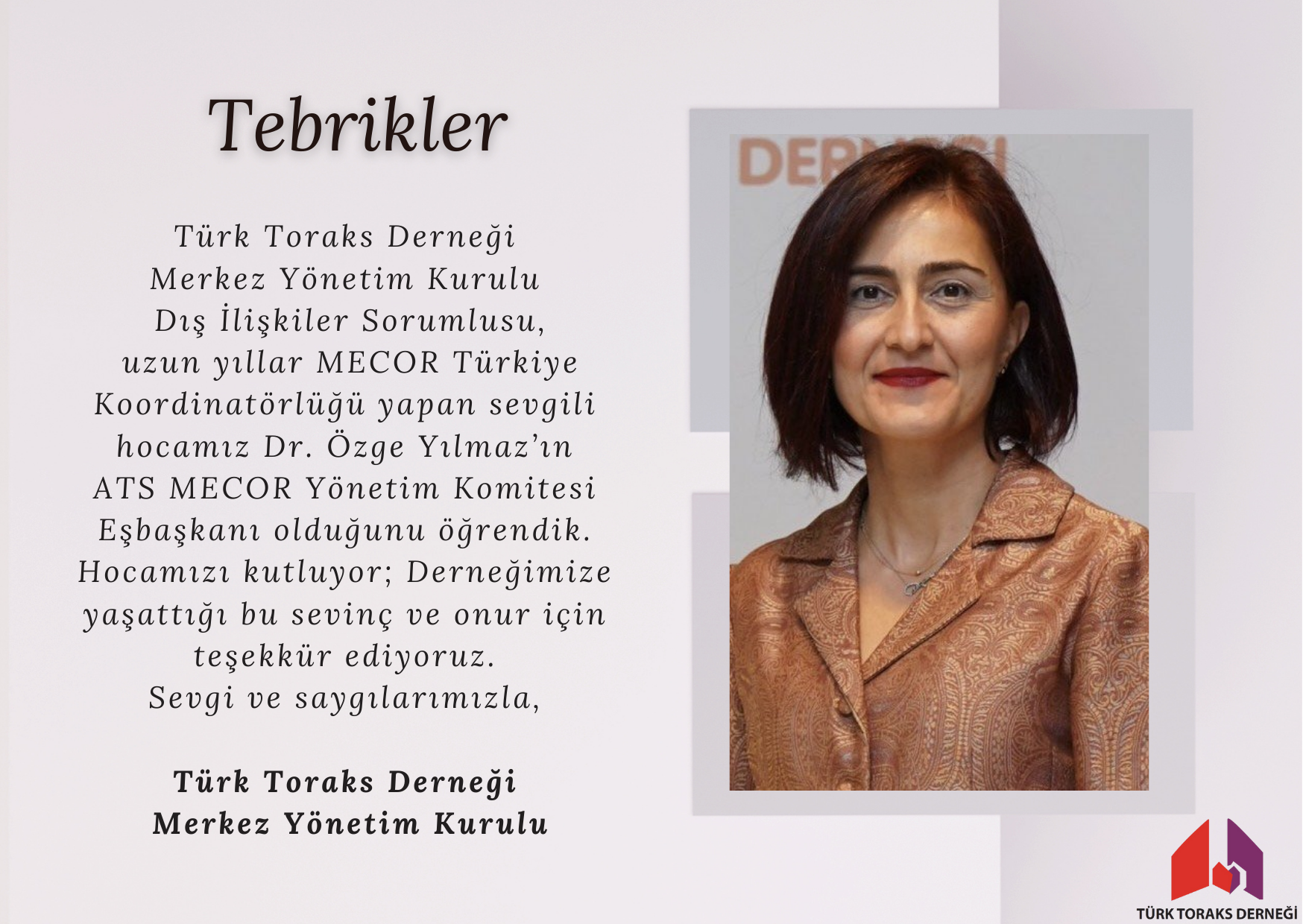 Türk Toraks Derneği Merkez Yönetim Kurulu Dış İlişkiler Sorumlusu, uzun yıllar MECOR Türkiye Koordinatörlüğü yapan sevgili hocamız Dr. Özge Yılmaz’ın